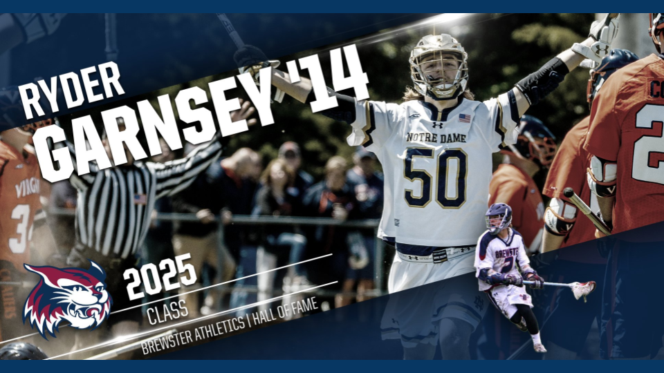 Few names in lacrosse are as recognizable as Ryder Garnsey, Class of 2014. A native of Wolfeboro and the son of longtime Brewster staff member Fred Garnsey, Ryder was a multi-sport athlete at Brewster, playing lacrosse, hockey, and golf. By graduation, he was the school's all-time leading scorer in lacrosse.